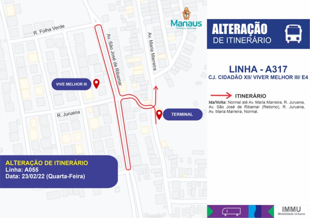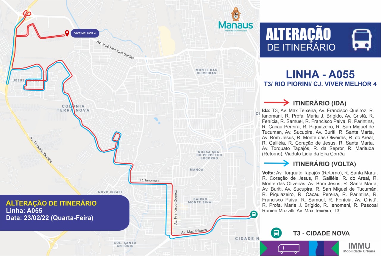 Quanto à A055, a linha passará a atender o Terminal de Integração 3 (T3), no bairro Cidade Nova 1, zona Norte. Por causa da mudança, a linha deixa de atender o conjunto Viver Melhor 3, que passa a ser atendido pela linha A317. A medida visa melhorar o percurso e frequência da linha, proporcionando melhor atendimento aos usuários do transporte público.