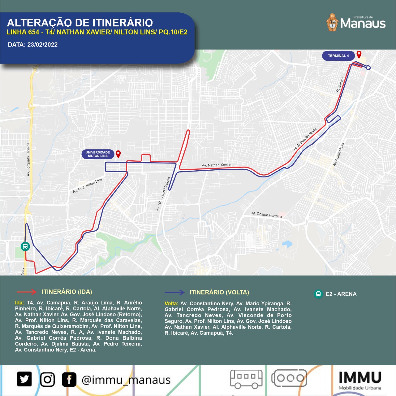A Prefeitura de Manaus, por meio do Instituto Municipal de Mobilidade Urbana (IMMU), informa que, a partir desta quarta-feira, 23/2, três linhas de ônibus das zonas Norte e Leste sofrerão mudanças para oferecer mais alternativas aos usuários de transporte público da cidade. As alterações serão nas linhas 654, A055 e A317.